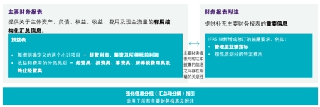 新增和强化应用指南以确定披露内容和披露位置 —— IFRS 18提供了详细应用指南,协助编制者运用职业判断确定应当在主要财务报表或附注中披露的信息。关键指引领域包括: