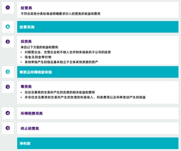 该小计项目包含归类于经营类别的所有收益和费用(详见下文)。经营类别涵盖主体“核心”业务活动的收益和费用,但不包括采用权益法核算的投资产生的收益和费用。但需特别注意的是,经营类别涵盖但不限于主体“核心”业务活动产生的收益和费用。因为该类别还涵盖不符合其他分类标准的收支项目,包括管理层认为不稳定的或不经常发生的项目。