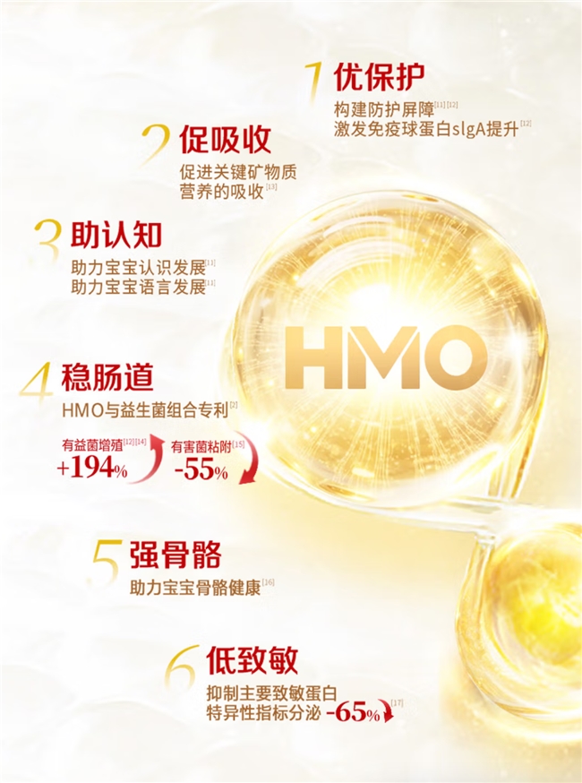 在夯实吸收基础的同时,金领冠珍护铂萃致力于提供全面的成长支持。产品含有36倍超高含量的乳源HMO专利组合,协同95%高纯度、100mg/100g高含量的乳铁蛋白,从多维度构筑宝宝自身保护屏障。在认知力发展方面,产品汇聚了包括高量DHA、脑磷脂群、燕窝酸等在内的18大活性脑营养群,旨在宝宝大脑发育黄金期提供丰富营养支持,助力认知发展。