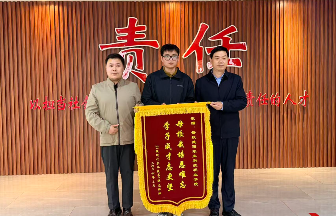 尤梓沣始终铭记师恩,感恩母校。在研究生考试结束后,他特意制作了一面锦旗,亲自送到德阳农业科技职业学院。锦旗上写着:“母校栽培恩难忘,学子成才志更坚。”在赠送锦旗的仪式上,他立下志向——学成之后,深耕农业领域,回报母校、反哺社会,用实际行动践行“成才报国”的理想。